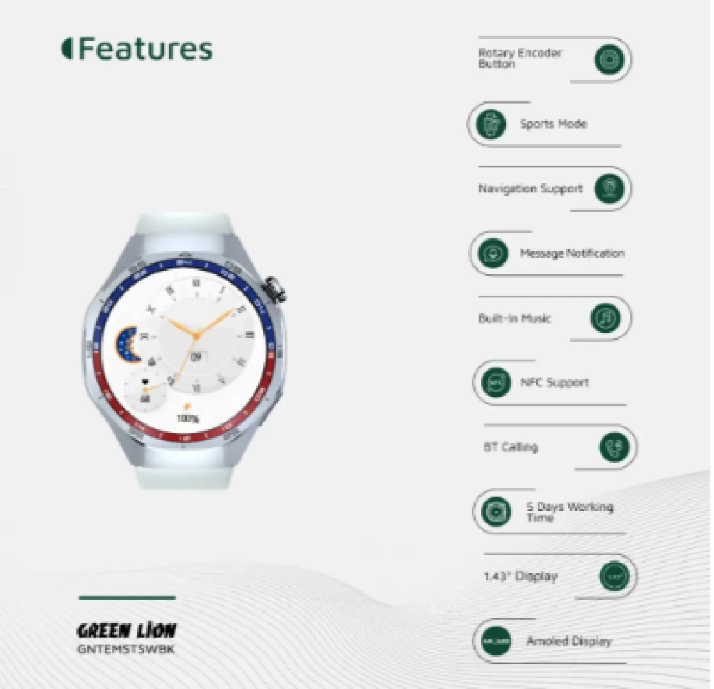 الوصف ساعة Green Lion Tech Master الذكية - المزيج الأمثل بين التكنولوجيا والأناقة. شاشة بقياس 1.43 بوصة بدقة وضوح 466×466. إلى جانب توفير صور نابضة بالحياة، تمنح الساعة تجربة لمس سلسة للغاية. تدعم بطارية ليثيوم بوليمر بسعة 400 مللي أمبير/ساعة وقت تشغيل طويل، حوالي 3-5 أيام، وحتى 10 أيام في وضع الاستعداد. تعمل هذه الساعة بذاكرة وصول عشوائي (RAM) بسعة 128 ميجابايت وذاكرة قراءة فقط (ROM) بسعة 1 جيجابايت، مما يوفر أداءً فعالاً، بالإضافة إلى اتصال Bluetooth 3.0 + BLE 5.3 لإقران سلس. تتميز الساعة بمكالمات Bluetooth وإشعارات الرسائل وتقنية NFC. بفضل مقاومتها للماء IP67، تضمن هذه الساعة الذكية المتانة عند ممارسة مختلف الأنشطة اليومية. تهدف هذه الساعة إلى تعزيز اللياقة البدنية والعافية، حيث تأتي مع أوضاع رياضية متنوعة، ومراقبة مستوى الأكسجين في الدم، وتتبع معدل ضربات القلب. كما تدعم نظام الملاحة المدمج، مما يوفر راحة إضافية للمستخدمين النشطين. ساعة Green Lion Tech Master الذكية متوافقة مع نظامي Android 5.0 وiOS 9.0 أو أعلى، وهي رفيق موثوق به في أنماط الحياة العصرية. المواصفات حجم الشاشة: AMOLED مقاس 1.43 بوصة دقة الشاشة: 466×466 (AMOLED) سعة البطارية: ليثيوم بوليمر 400 مللي أمبير/ساعة ذاكرة الوصول العشوائي (RAM): 128 ميجابايت ذاكرة القراءة فقط (ROM): 128 ميجابايت + 1 جيجابايت هيكل الساعة: ألومنيوم بلوتوث: BT 3.0 + BLE 5.3 مدة الشحن: 2-3 ساعات مدة التشغيل: 3-5 أيام مدة الاستعداد: 8-10 أيام مستوى مقاومة الماء: IP67 توافق النظام: Android 5.0 و iOS 9.0 أو أحدث رمز المنتج: GNTEMSTSWBK | GNTEMSTSWSL GTIN: 0990478120600 | 0990478120617 الميزات: مكالمات بلوتوث وضع رياضي دعم الملاحة الرسائل إشعارات دعم NFC أكسجين الدم معدل ضربات القلب ساعة تيك ماستر الذكية